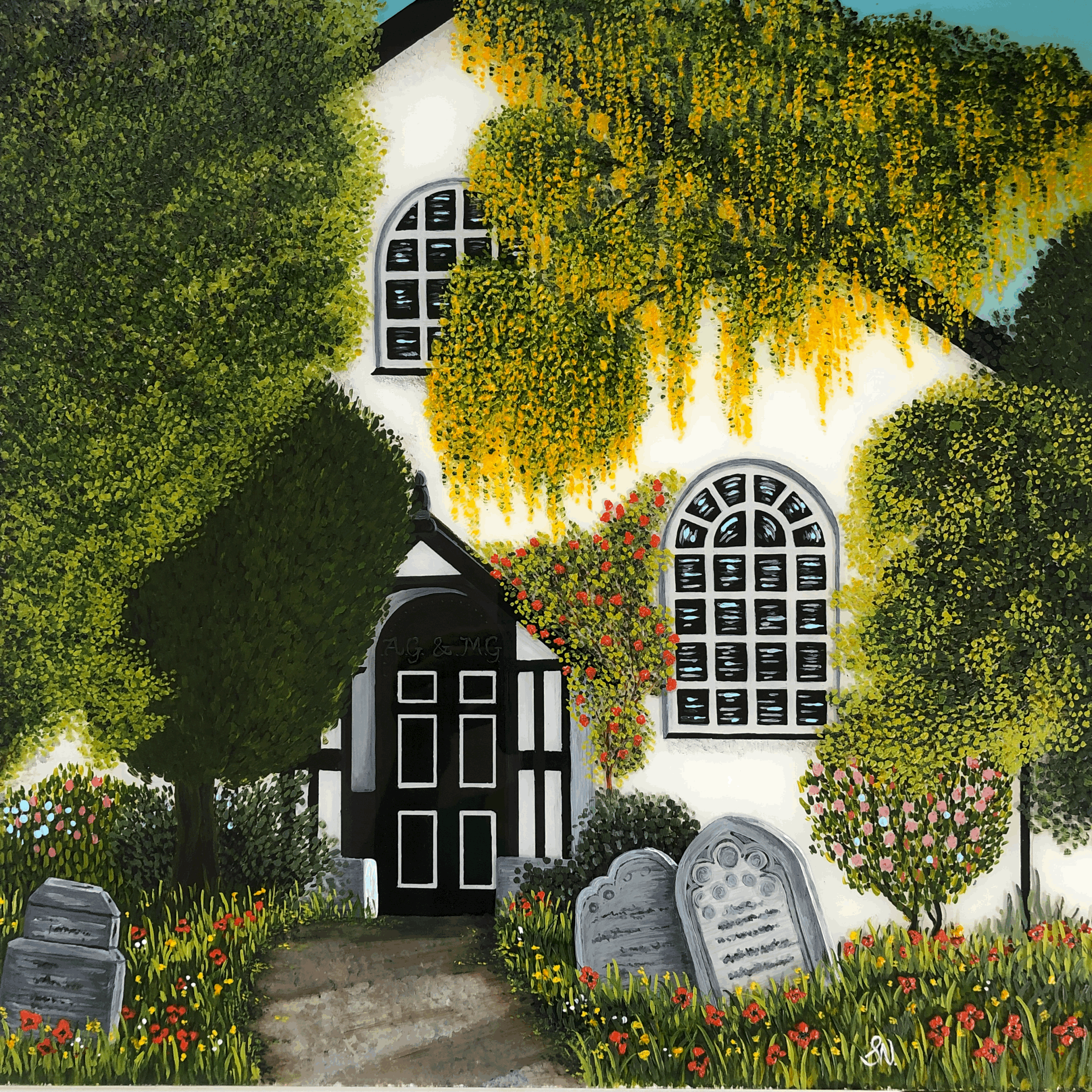 What a gorgeous place to get married. This painting was done to celebrate the wedding anniversary for a couple that got married in Snailbeach Church in Shropshire. It’s painted on the front and back of a sheet of glass in acrylic paint. Little personal touches were added to the painting; such as Laburnun in front of the church (which was something memorable from my clients childhood), making the graveyard brighter and more like a meadow and adding the couples initials above the church door.