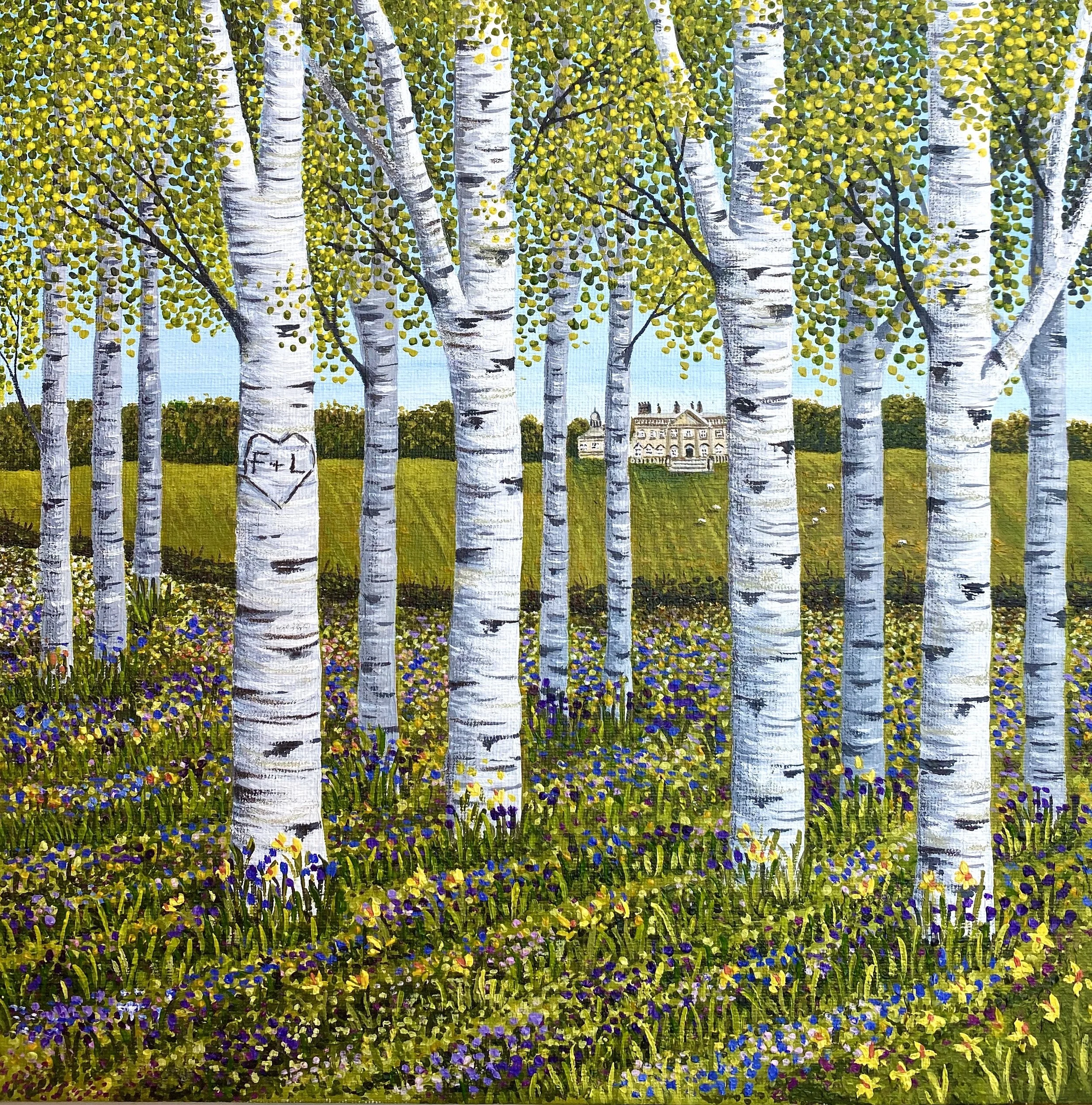 I was asked to paint this as a belated wedding present for a couple who got married at this beautiful venue. My client loved a particular view of the manor house through a wooded area but wanted it to be brighter. I added lots of spring flowers to give it a lift from the original photo and make it lighter. The couples initials were painted onto one of the silver birch trees. It was painted in acrylic on artists board.